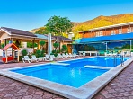 На территории работает кафе с детским меню, есть два открытых бассейна с детским отделением и зоной отдыха. Один бассейн размером 14х5 метров работает круглогодично, второй 11х4 метра сезонно. Гостям доступны услуги прачечной, беспроводной интернет и охраняемая автостоянка. Для детей обустроена игровая площадка с горками и качелями.
