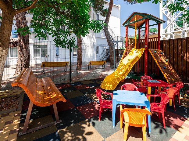 Есть небольшой, но уютный уголок для детей в тени деревьев рядом с бассейном. Детский уголок покрыт специальным противоскользящим мягким покрытием, обеспечивающим безопасность детей во время активных игр. В уголке есть детские двухместные качели (для детей весом до 45 кг), игровой домик и столик для рисования и настольных игр. А для родителей в детском уголке есть лавочка, с которой удобно наблюдать за детской игрой.
