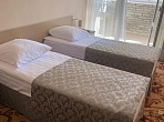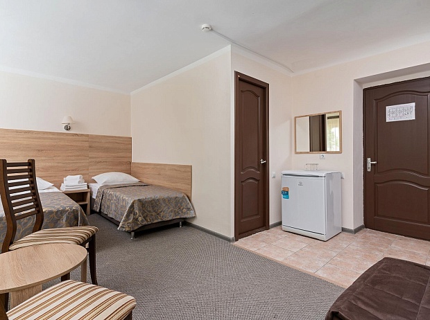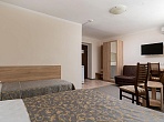 «Приморский» предлагает Гостям комфортные номера с балконом, оборудованные спальным гарнитуром, журнальным столиком, стульями, телевизором, холодильником, кондиционером и другими необходимыми удобствами.