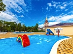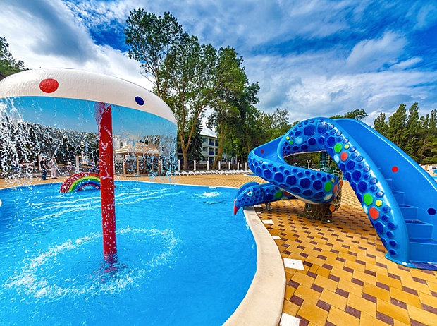 Детская зона меньше (длина 12 метров, ширина 8 метров). Для детской безопасности глубина детской зоны варьируется от 30 до 60 см. Так же для детей предусмотрены водные аттракционы – две горки и грибок.