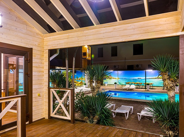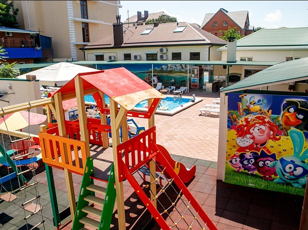 На территории работает кафе с детским меню, есть два открытых бассейна с детским отделением и зоной отдыха. Один бассейн размером 14х5 метров работает круглогодично, второй 11х4 метра сезонно. Гостям доступны услуги прачечной, беспроводной интернет и охраняемая автостоянка. Для детей обустроена игровая площадка с горками и качелями.