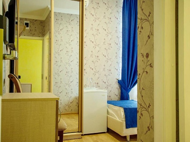 Небольшое здание отеля разместилось на благоустроенной закрытой территории. Гостей ожидают просторные номера категории Стандарт, Студио, Семейный, Люкс и вместительные четырехместные апартаменты. Во всех номерах помимо удобного мебельного гарнитура, установлена сплит-система, есть сейф, телевизор, собственный санузел с ванной или душевой кабиной, в апартаментах и семейных номерах оборудованный кухонный уголок.