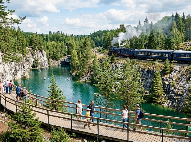 Погрузитесь в очарование прошлого с ретропоездом «Рускеальский экспресс» – уникальным туристским поездом на паровозной тяге*. Вас ждут купейные вагоны, стилизованный вагон-ресторан и фотокупе с интерактивной системой для моментальных фотографий.