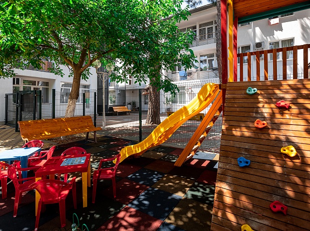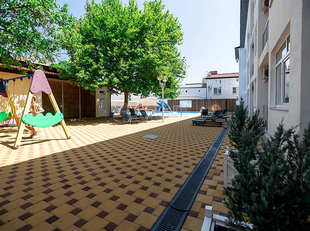 Есть небольшой, но уютный уголок для детей в тени деревьев рядом с бассейном. Детский уголок покрыт специальным противоскользящим мягким покрытием, обеспечивающим безопасность детей во время активных игр. В уголке есть детские двухместные качели (для детей весом до 45 кг), игровой домик и столик для рисования и настольных игр. А для родителей в детском уголке есть лавочка, с которой удобно наблюдать за детской игрой.