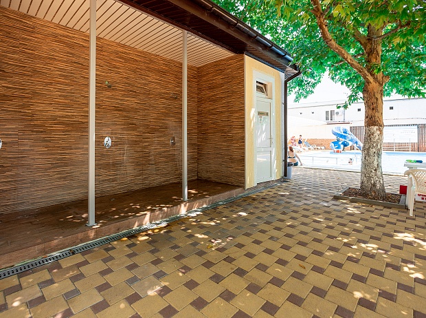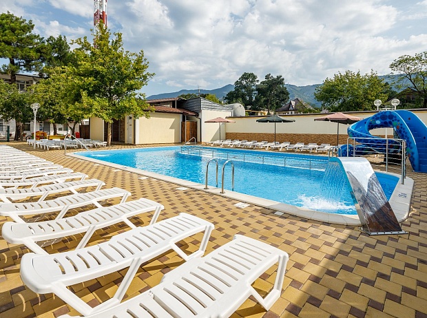 Зона у бассейна выложена противоскользящей плиткой, по которой удобно ходить даже босиком. Здесь же можно позагорать на лежаке. Лежаков у бассейна хватает на всех постояльцев пансионата. Поэтому Вам не придётся бороться за место под солнцем. Для тех, кто предпочитает избегать солнечные ванны, имеются лежаки под теневым навесом.