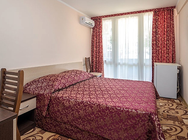 В номере двуспальная кровать размером 160*200 с ортопедическим матрасом, прикроватные тумбочки, ЖК телевизор, шкаф, стол, холодильник, сейф, сплит-система, напольная раскладная сушилка.