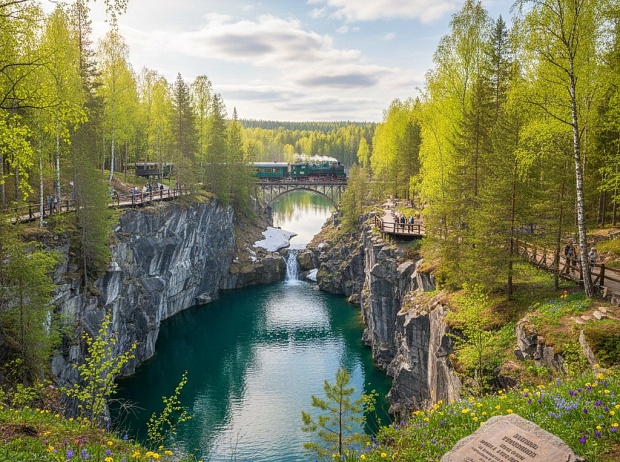 Живописные мраморные скалы отражаются в зеленоватой глади чистейших озёр, Рускеала - символ возрождения карельской земли, символ гармонии человека и природы!